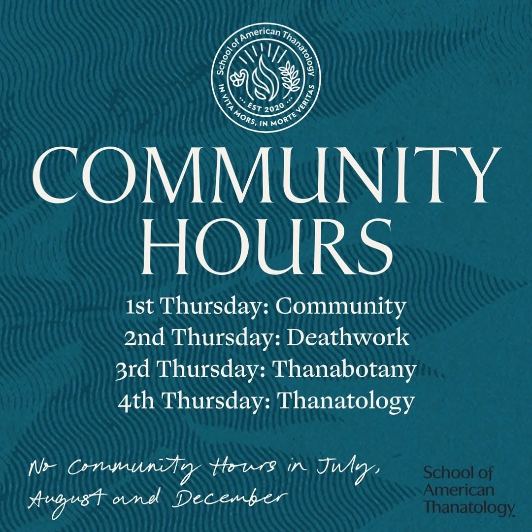Community Hours will take place at the same time, but not happen every week of the year, and will also be an hour. They will still be general open time to be together except each week will be connected to one of the primary areas of focus at the school: Community, Deathwork, Thanabotany and Thanatology, in that order.